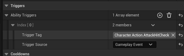 Ability Triggers 요소를 추가하고 Trigger Tag에 해당 Tag (Character.Action.AttackHitCheck)를 넣으면