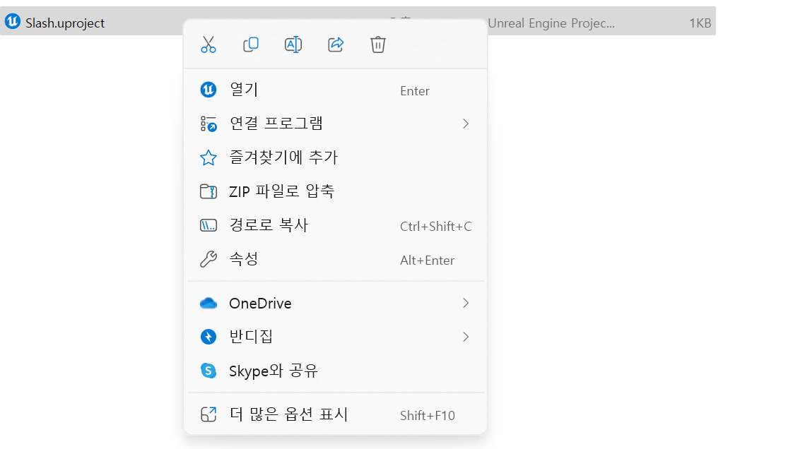 그리고 uproject를 우클릭하고 더 많은 옵션 표시를 클릭한다.